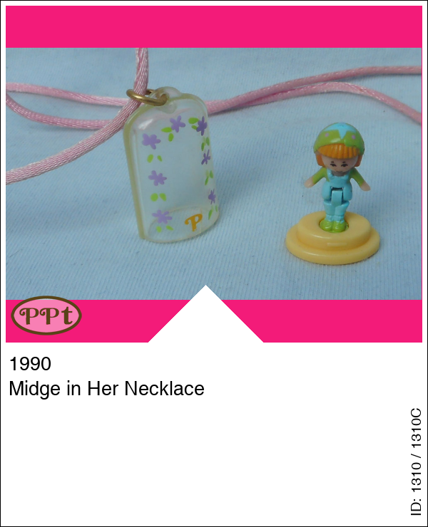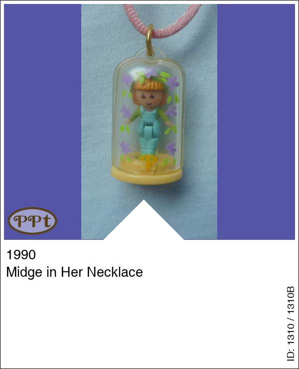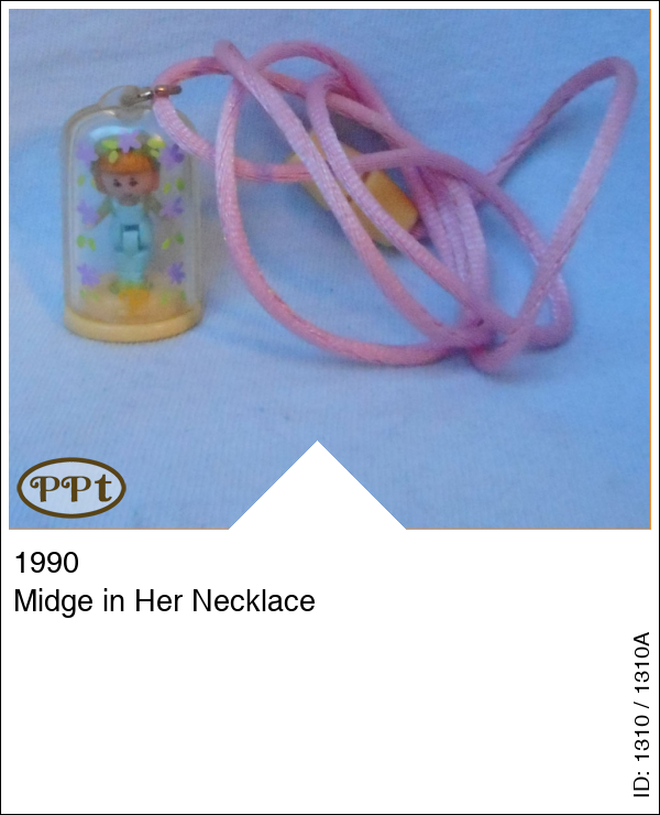 Dit is een ketting met hieraan een stolpje, de onderkant is licht geel. In dat stolpje zit Midge en ze heeft een hoofddoekje op haar hoofd.