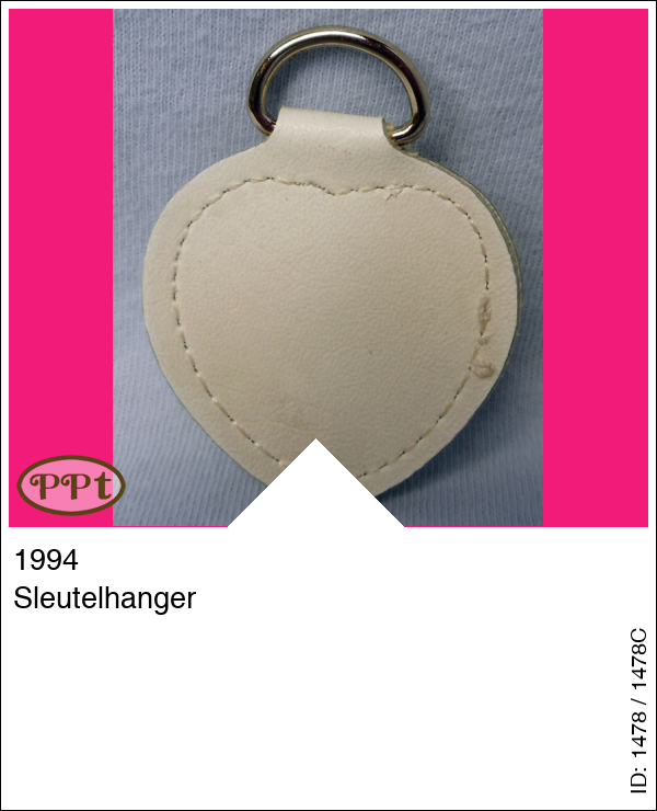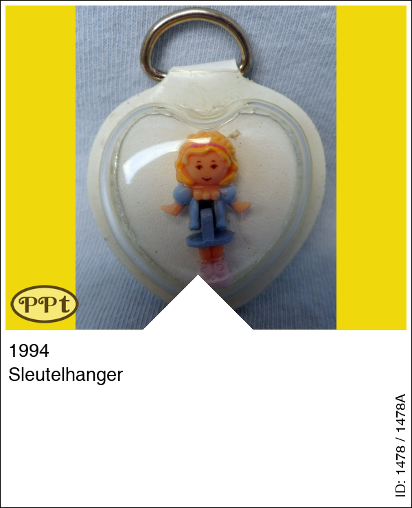 Dit is een sleutelhanger in de vorm van een hartje van wit leer en hierop zit een hard plastic doorzichtig kapje en onder dat kapje zit Polly, dus zo heb je ze altijd bij je met je sleutels. Met Polly