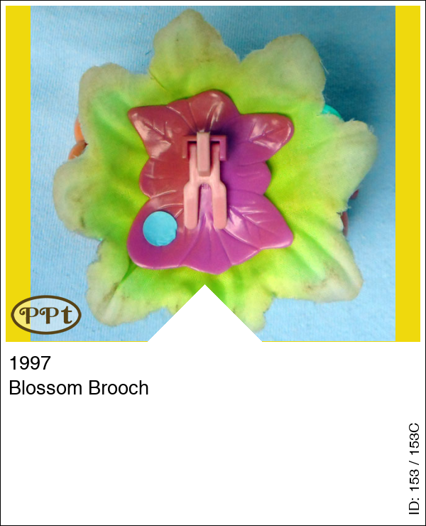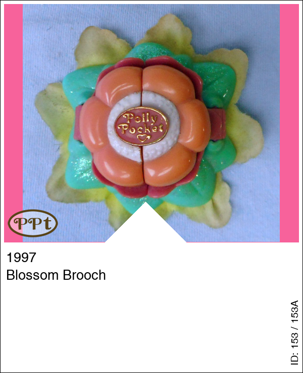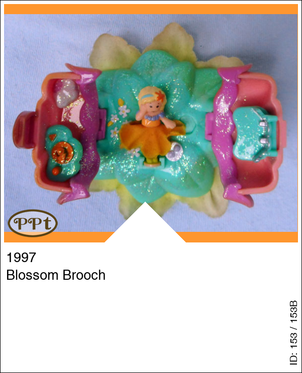 Blossom BroochUpdate: 01-03-2023 Het is een broche met veel glittertjes, binnen in zie je een kaptafel en een gedekte tafel. Polly met geel rokje.