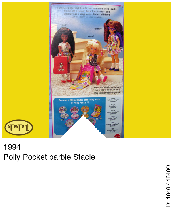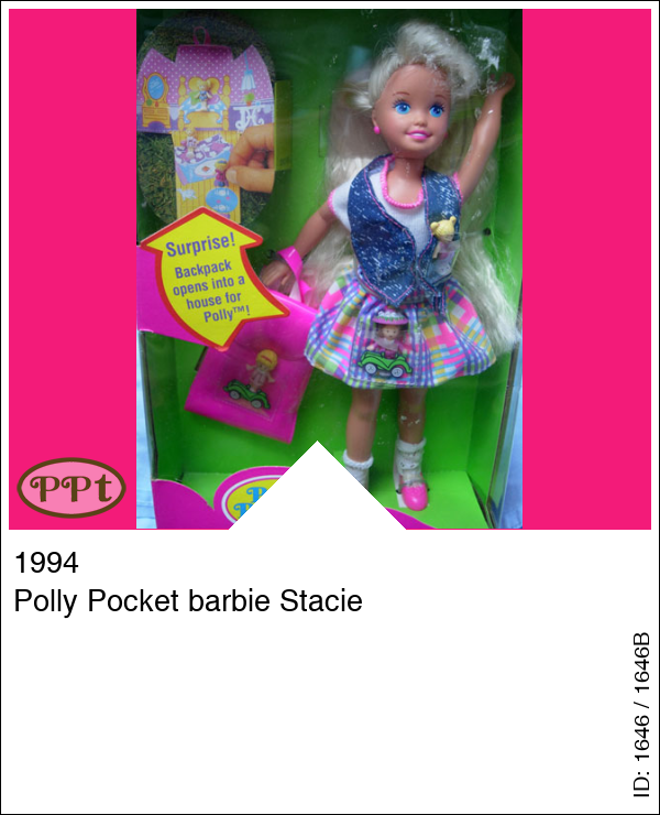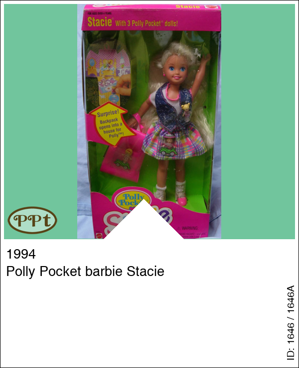 Stacie is een Speciale uitgave van Mattel met 3 polly pocket poppetjes welke ze in haar zakken van haar jurk kan doen. Ook heeft ze een tas bij zich waar ook een popje in zit en als ze die tas open doet kan ze spelen met de popjes want in de rugzak zit een afbeelding van een slaapkamer met kaptafel en huiskamer met spelend katje.