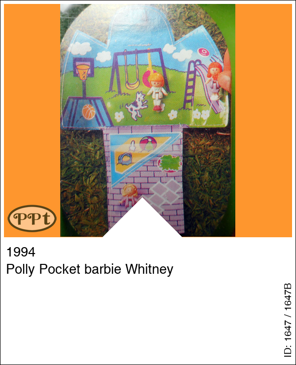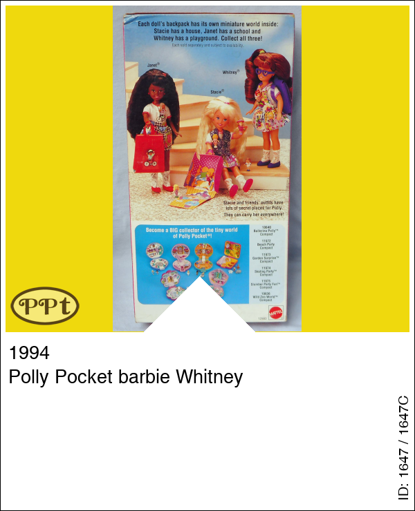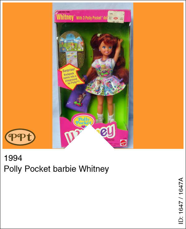 Whitney is een Speciale uitgave van Mattel met 3 polly pocket poppetjes welke ze in haar zakken van haar jurk kan doen. Ook heeft ze een tas bij zich waarop je voorop ook een polly pocket poppetje kan stoppen en als ze de tas open doet kan ze spelen met de popjes want daar zie je een speeltuin.