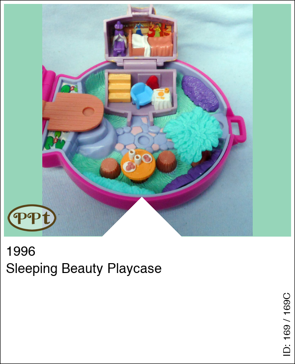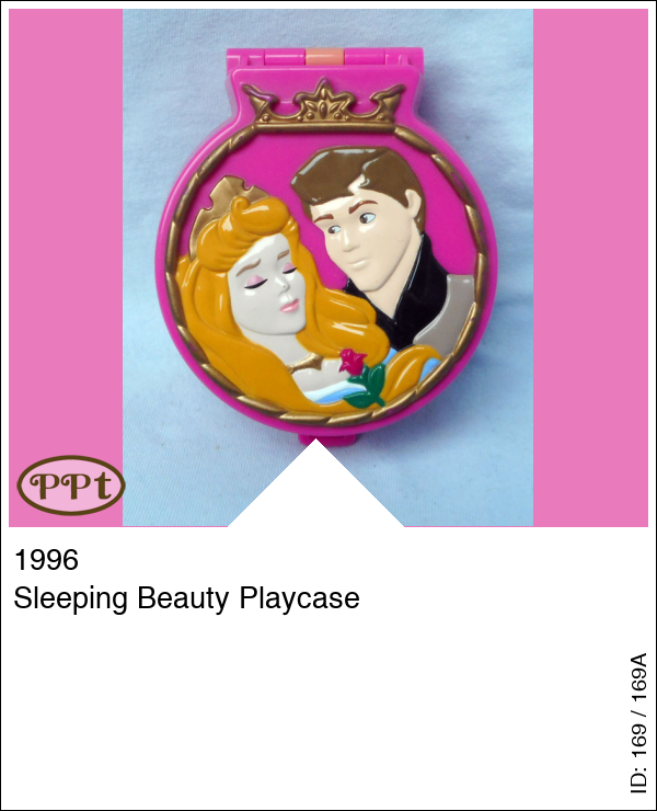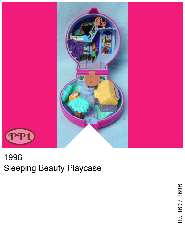 Een roze doosje met voorop Doornroosje en Prins Charming. Binnen zie je aan de bovenkant het spinnenwiel, bed en de doornstruik hierachter staan 2 stoelen en 1 tafel met kandelaar, De plaatjes zijn de 3 feeen, vader en moeder bij de wieg. Op het andere plaatje staat de boze fee.