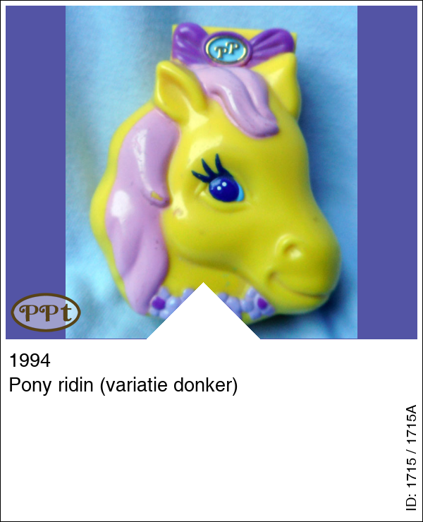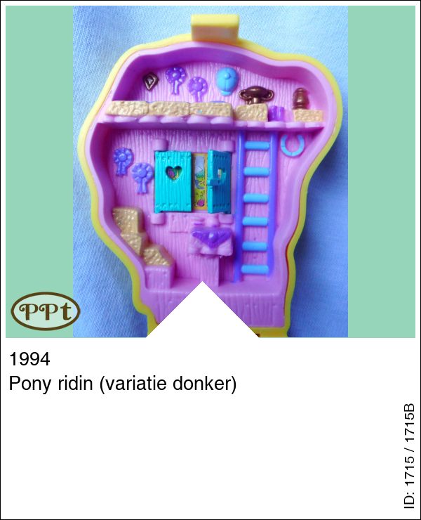 Een donker geel doosje in de vorm van een paardje met paarse manen. Als je dit doosje opendoet zie je boven een hooizolder met trapje en daar ligt een bed van stro een paar bokalen en een cap en laarzen, 2 raampjes die je open kunt maken en daarachter zie je een buitentafereeltje. Beneden is de wei waar het paardje staat. Polly en 1 zwart paardje