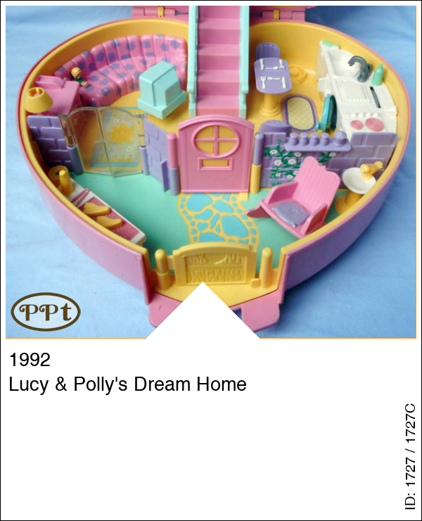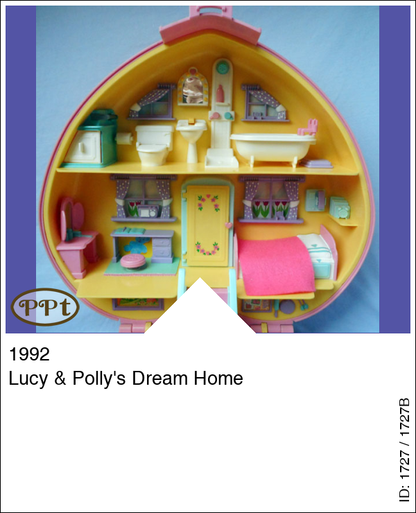 Binnenin is ook hetzelfde al een klein doosje met badkamer, slaapkamer, woonkamer en keuken alleen hier kunnen veel deurtjes open en dicht. Polly heeft op een paar plekjes een eigen zitje waar je ze kunt inklikken. Bij het raam, op de bank, in de keuken en bij het bad. Leuk om te zien. Met Lucy, Polly, kam, schoentjes en 4 pannetjes, 2 kommetjes, 1 schotel, 1 hek, telefoon, weegschaal, 2 kledinghangertjes.