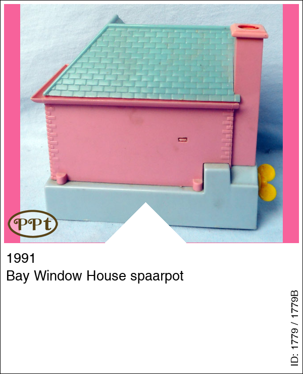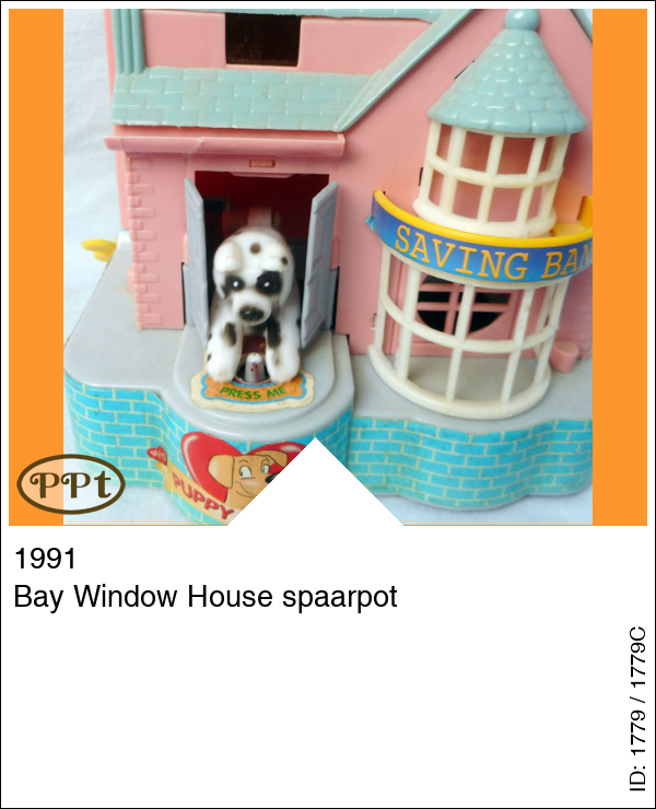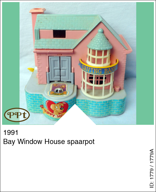 Dit is een spaarpot in de vorm van het Bay Windows House, je draait aan de zijkant aan het gele knopje dan leg je op het matje voor de deur geld weg en het hondje komt dan naar buiten om het centje te pakken.