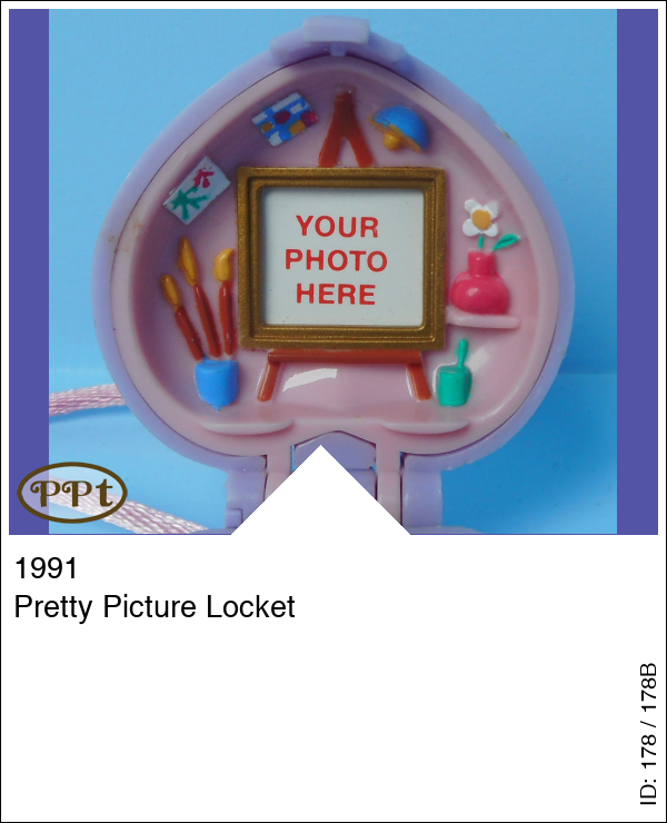 Een lila hartje als halsketting. Aan de binnenkant een schilders tafereeltje. Je ziet een groen bedje en een pottenbakkers wiel met potje en daarnaast staat een verfpotje en er staat een blauwe stoel, in het dekseltje zit een ezel met schilderijtje erop en je kan hierachter een foto van jezelf achter doen, er staan ook wat penseeltjes en wat potjes verf. Met Polly als schilder.