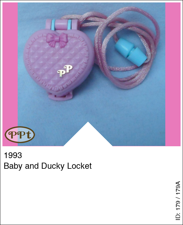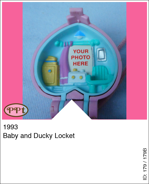 Een roze hartje als halsketting. Aan de binnenkant een kant waar je een foto kan doen en daar zie je bad spulletjes en een stoel en aan de andere kant een badje met eendje die je kan bewegen. Compleet met Polly, baby Joe met blauw luiertje en een roze ketting met blauwe sluiting.