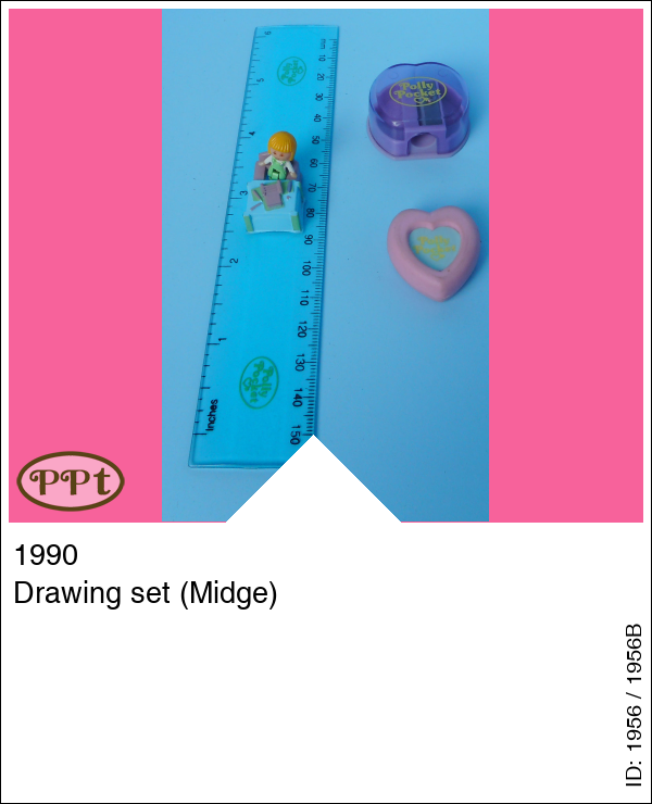 Dit is een schrijfset met Midge, en hier zie je een lineaal met daarop een tafeltje en dit zit er vast op, gum (hartje), en een puntenslijper.