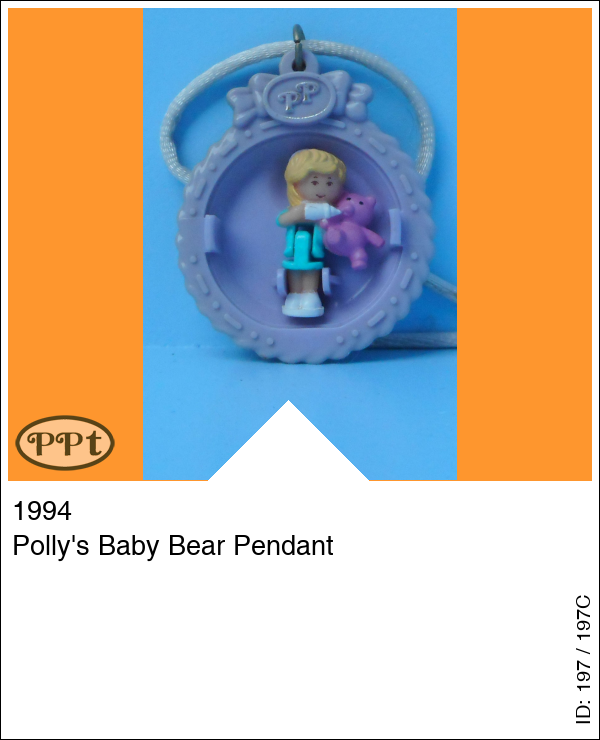 Polly's Baby Bear PendantUpdate: 17-02-2023 Een halsketting met aan de buitenkant van het geel/paarse doosje een roze berengezichtje en binnenin zit Polly met een beertje in haar armen en ze geeft de fles.