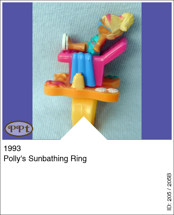 Polly's Sunbathing RingUpdate: 01-03-2023 Ring met polly die ligt te zonnebaden op een ligstoel, je kunt de ring uit elkaar halen dan heb je 3 delen en Polly met zonnebril en stoel en gele ring.
