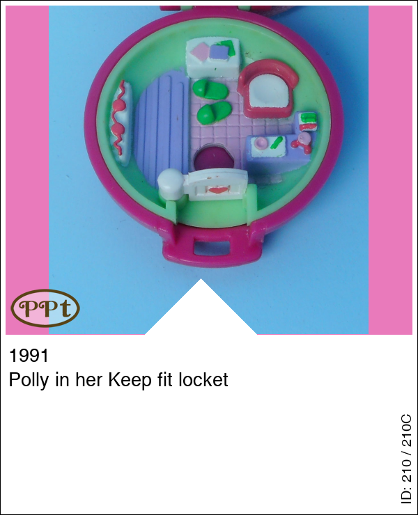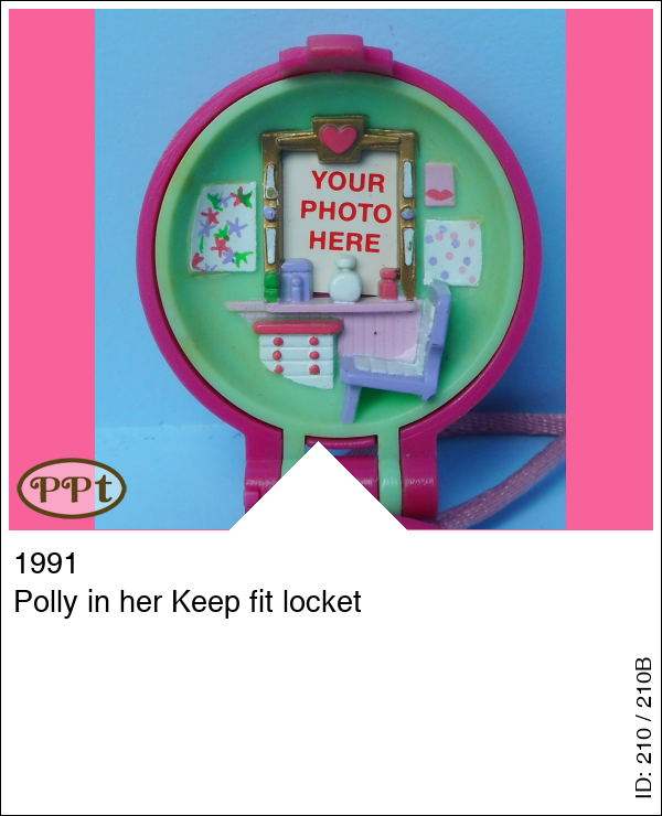 Een roze doosje als halsketting. Als je het doosje opent kan je er aan de ene kant een foto in doen. Aan de andere kant is een bureau en een fitness matje en daarvoor staan schoentjes. Met Polly en een groene handdoek op haar hoofd.