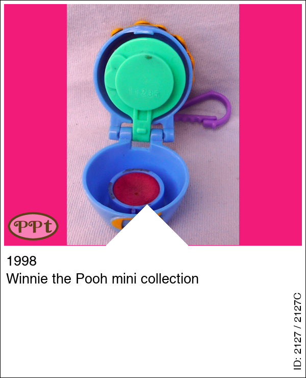 Super gaaf klein honing potje met hierin Winnie the Pooh, het is een sleutelhanger en als je de bovenkant open maakt is daar Winnie op een groen plateau en er liggen wat paarse honing potjes. Als je Winnie eruit haalt kan je dmv de stempel onder zijn poten, stempelen op het stempelkussen onder het groene plateau. Met Winnie The Pooh.