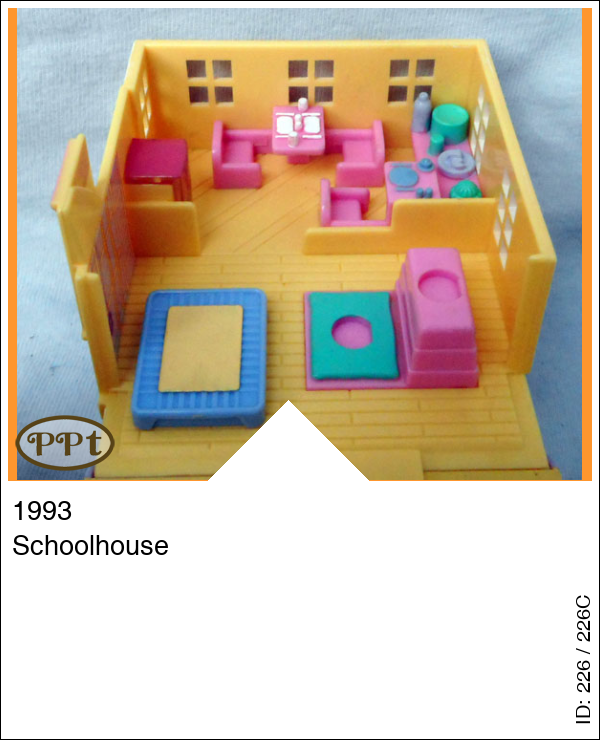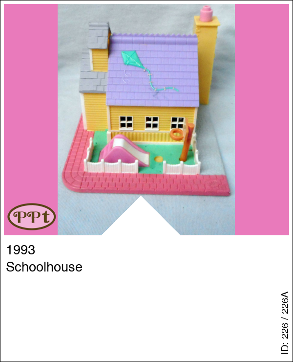 Het schoolhuis met licht. Als je het dakje omhoog doet dan zie je boven de kantine met drankautomaat incl. licht, je ziet een trampoline en bok. Beneden onder de trap zie je een toilet met deur open kan, een keuken en een verlichte klok. Dan ga je de deur door en daar is het klaslokaal met schoolbord, radiator, computer, tafeltjes en stoeltjes. Buiten staat een glijbaantje en er staat een basketpaal. In de hal zie je de fietsenstalling en een piano voor muziekles. Ook hangt hier de gouden schoolbel.