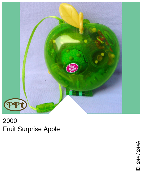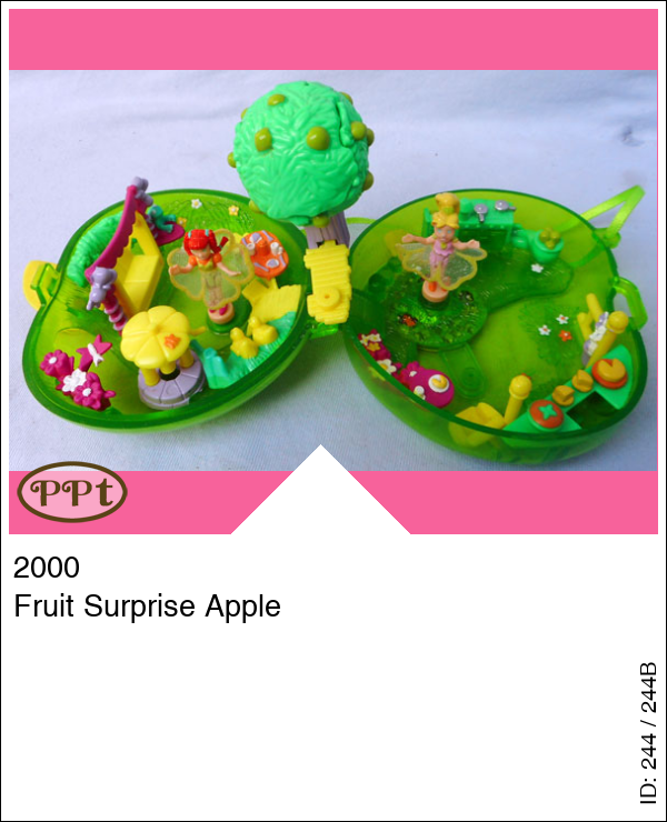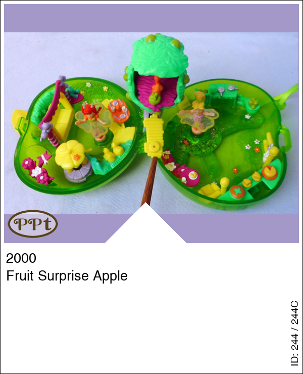 Een groene appel en als je het doosje openklapt komt de boom in het midden en als je op het gele hendeltje drukt onder de boom komt er een eekhoorntje uit met appeltje. De ene kant zie je bloemen met vlinder een schommelbank, oranje picknicktafel, 2 eendjes en een wensput. Aan de andere kant is een taart verkoop en een roze tafel en gele stoel, een groen fornuis met oven welke echt open kan en daar staan 2 taartjes in. Ook zie je een draaischijf met verschillende plaatjes.