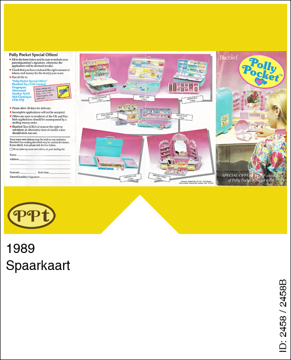 Super leuke spaarkaart waarmee je items kon sparen van Polly Pocket, je kon sparen voor de oorbellen uit 1990, de jewellery box uit 1989 en voor de aqua gearbox 1991. Je kocht dan ringen, doosjes, pencil tops, soap dish, pendants, cassette player, jewel case, money box, hair care set, pencil case, writing case en dressing table, daar stonden spaarpunten achterop de verpakking welke je uitknipte en kon inleveren.