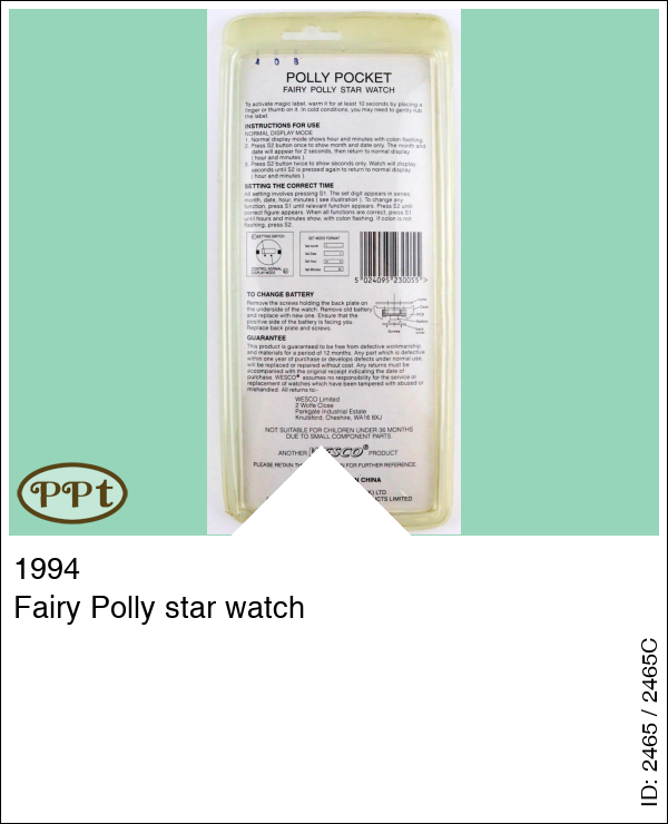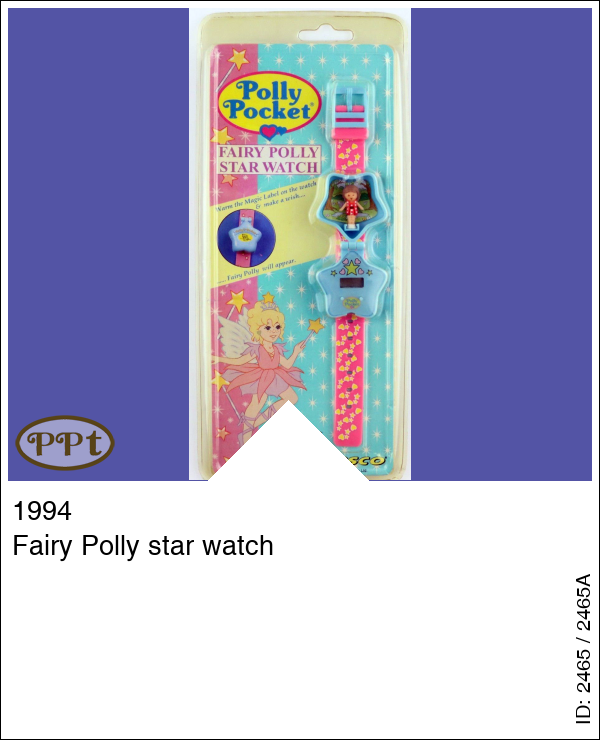 Horloge met roze band met daarop hartjes en sterretjes. Het horloge zelf is blauw en heeft de vorm van een ster. Aan de voorkant van het horloge komt Polly tevoorschijn als je het warm maakt met je hand. Met Rosie. Tekst op verpakking (warm the magic label on te watch & make a wish, fairy polly will appear)