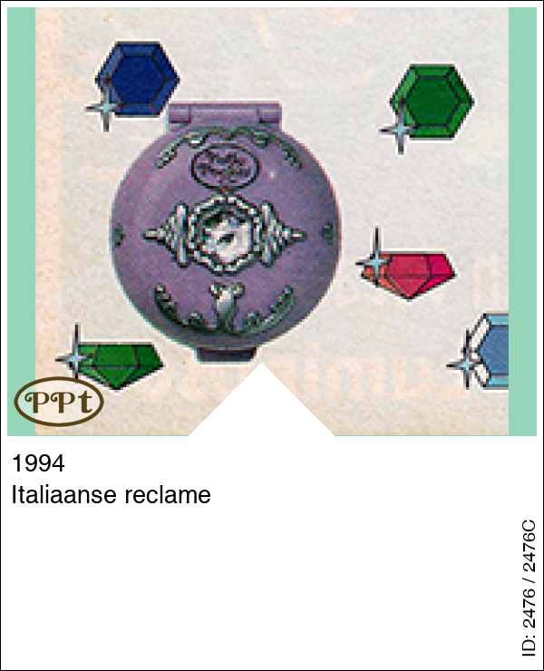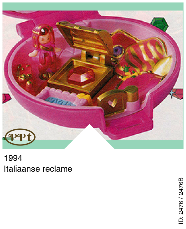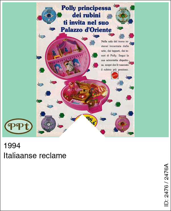 Reclame uit het italiaans blad Mezzalunarossa hier komen Jeweled palace, Jeweled sea, Jeweled forest en Jeweled iceland op voor.Bij de titel staat: Polly prinses van robijnen nodigt je uit in haar oosterse paleis.