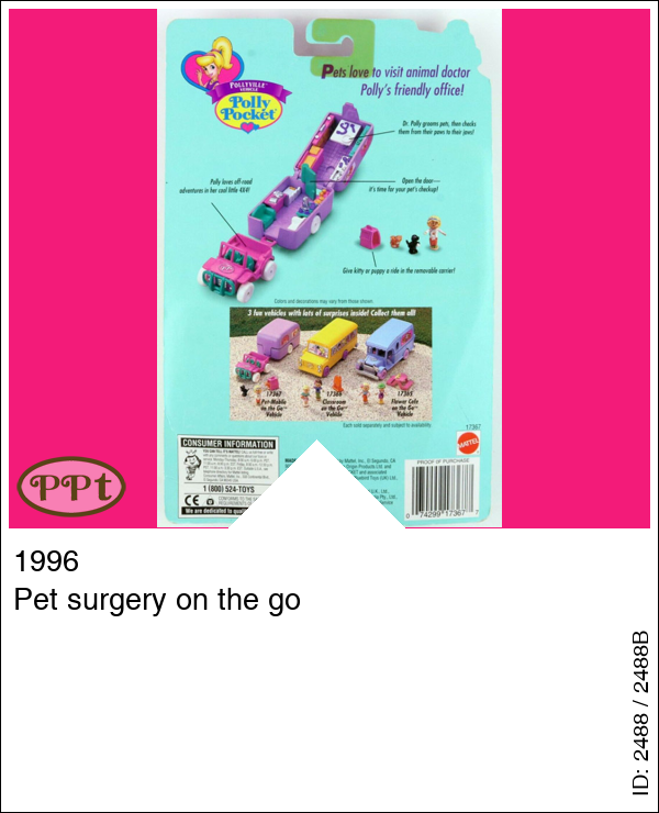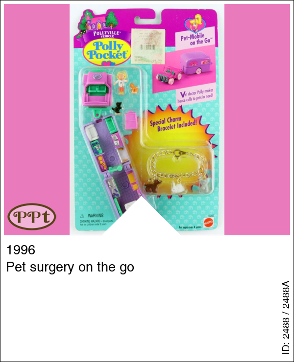 Een auto met caravan binnenin is het een dierendokter met allerlei verschillende spulletjes. Er hoort 1 poes genaamd Fluff en 1 hondje genaamd Raggle, Polly en de roze transportbox en het extra armbandje bij.