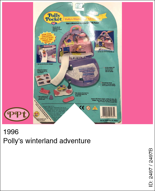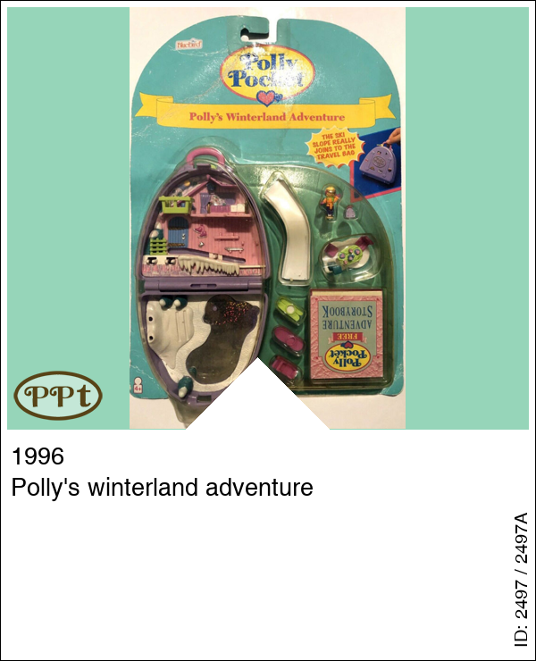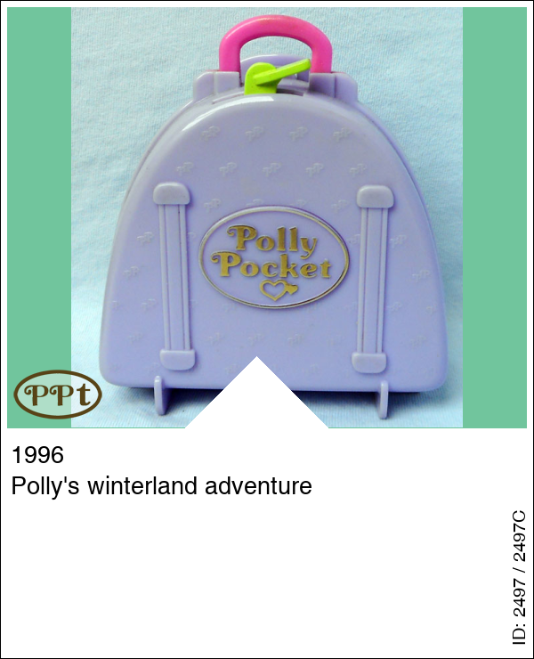 Dit is een paars koffertje met een winterse binnenkant met een skihutje met bed en balkon, een klein glijbaantje te bedienen vanaf de buitenkant en een schaatsbaantje. Het tafeltje is een los onderdeeltje en het sleetje kan ook los. Polly in skikleding, skies, slee en snowboard, stickers en het mini koffertje.