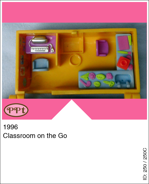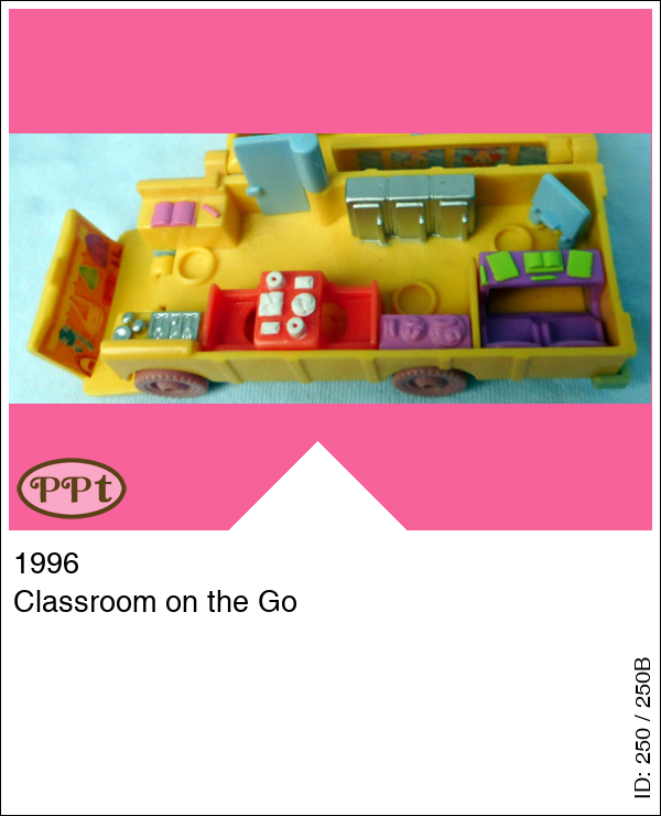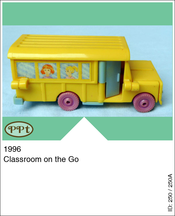 Een bus met aan de buitenkant de gezichtjes van de kindjes. Binnen zie je een school-lokaal compleet met schoolbord en bankjes, een picknicktafel, kluisjes, een tafel met daarop een computer, en een knutseltafel met pottenbakker machine. Met Polly en een boekje onder haar arm en Alexia met een hartje in het haar.