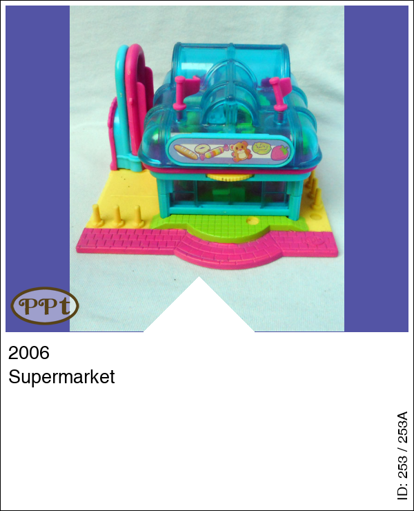 Dus dit is een winkeltje met blauw glazen lichtkoepel, hieronder zit het cafe met afhaalband voor eten/drinken en een kassa ook voor de kleintjes een vliegtuigje waar ze in kunnen en dit draait. Onder het cafe zit de winkel en als je aan het wieltje draait gaan de klapdeuren open, met diepvries die echt open kan en heel veel boodschappen, je kunt er met het winkelwagentje doorheen lopen. De band waar je de boodschappen oplegt die werkt ook echt. Aan de andere kant kun je de auto parkeren en is er ook een lift. Met een blauw winkelwagentje en losse boodschapjes, Polly en de knalroze auto.