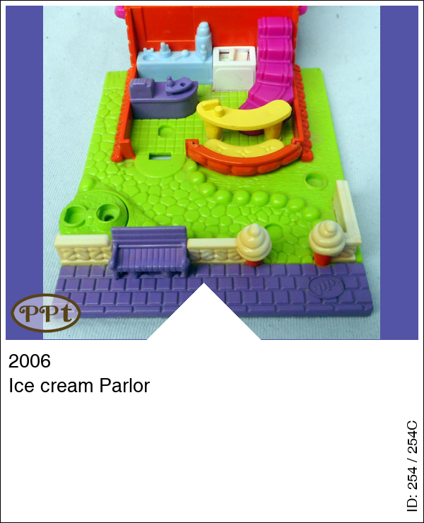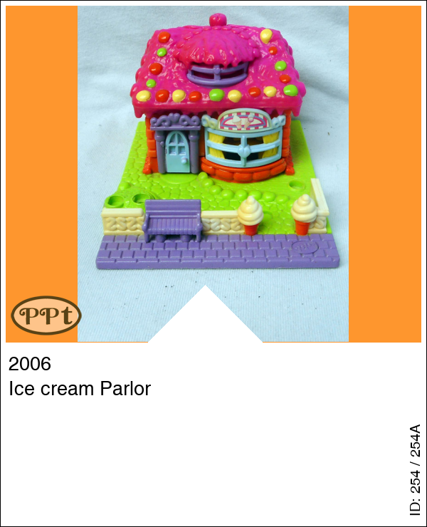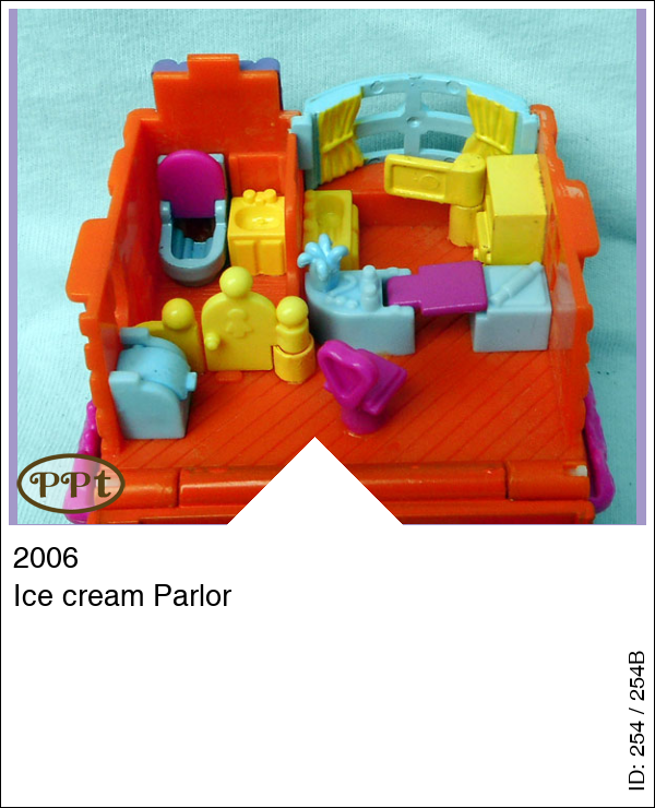 Dit is een exemplaar van de Ice Cream Parlor 2006 en dit is een speciale uitgave voor het 10 jarige bestaan.(zie extra aanvulling). Dit is een lekker knalroze ijs-winkeltje met aan de ingang 2 ijshoorntjes, een draaiplateau en een bankje. Het dakje ligt vol snoepjes. Binnen is een ijs shop met een toonbank een koelkast met ijsjes en een tafel waar je de ijsjes kunt opeten. Als je de trap oploopt dan kom je bij een cocktail bar waarvan de bar omhoog kan en daarachter is een vrieskast met deurtje wat open kan. Voor de bar staat een draaistoeltje en ja ziet een toilet met bril die echt omhoog kan. Met 1 poppetje met ijsje in hand.