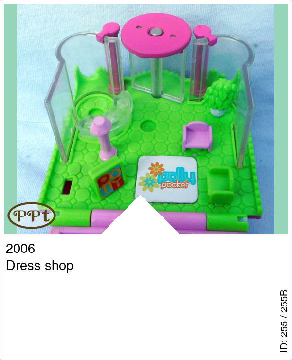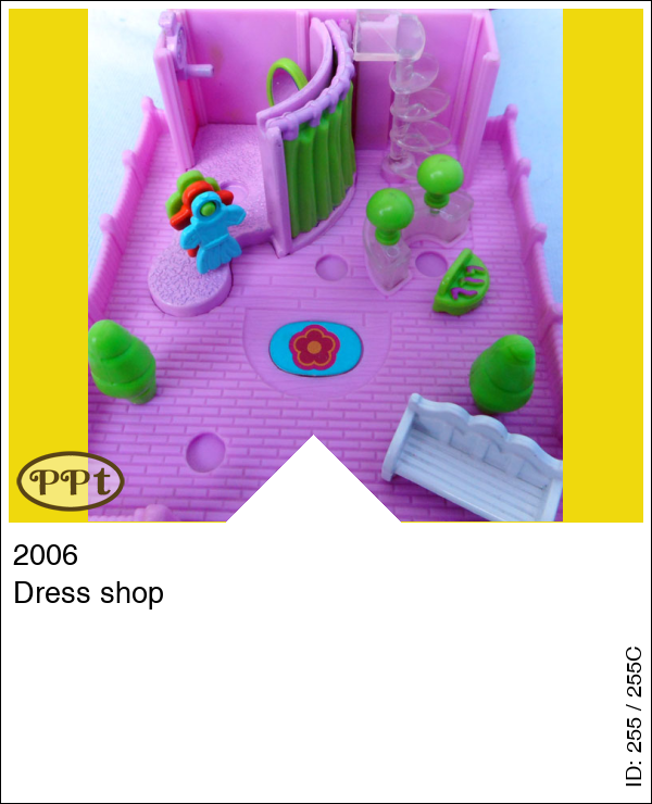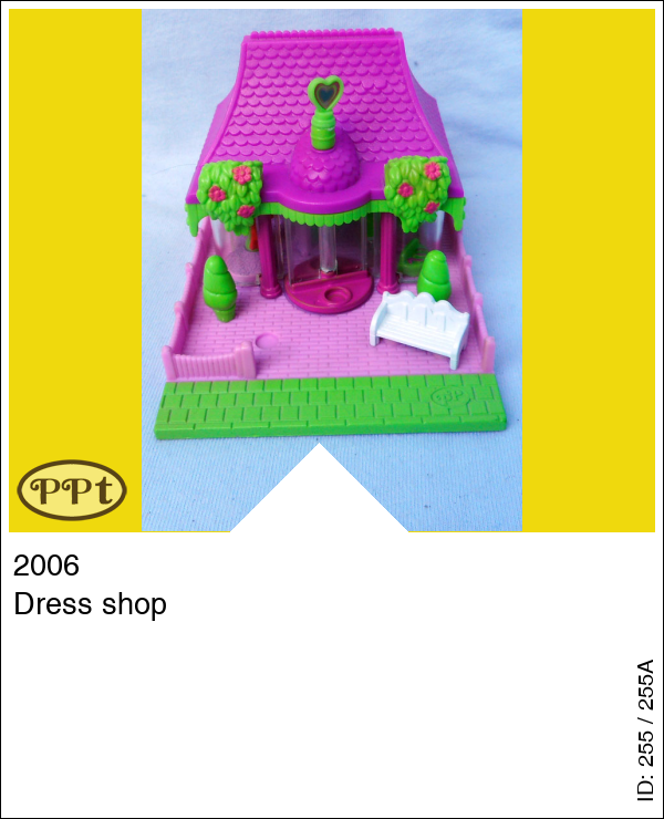 Dit is een exemplaar van de supermarket 2006 en dit is een speciale uitgave voor het 10 jarige bestaan.(zie extra aanvulling)Het is een leuk winkeltje met aan de buitenkant een bankje en 2 boompjes, als je aan het hartje draait dan gaat de draaideur bewegen. Binnen zie je beneden een pashokje en een toonbank en een rekje met 2 jurkjes die ook eraf kunnen. Ga je de doorzichtige trap omhoog dan kom je in een andere ruimte met stoeltjes een toonbankje en een plant.