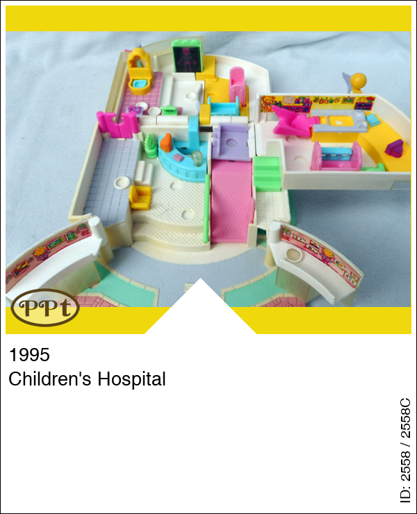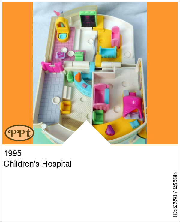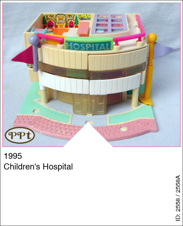 Dit is het ziekenhuis met de letters HOSPITAL. Ik begin op het dak daar zie je een dakterras met een glijbaantje, ligbank en bankje. Je ziet de paarse vierkantjes dat moet glas voorstellen waardoor je naar binnen kunt kijken. Klik het dak open en dan zie je de kinderafdeling met 2 kinderbedjes die kunnen bewegen. Het blauwe schaaltje om de baby's te wegen, dit kan er af. Er is een operatietafel en een rontgen apparaat waar licht in gaat branden. Dan zie je aan de andere kant nog en babykamer met bedje en die verdieping kan je weer wegdraaien. De deuren kunnen open en daar zie je klapdeurtjes en een balie met lampje wat echt werkt en een rolstoellift die werkt ook echt. Aan de buitenkant zit het lichtknopje dit is een bosje. Tawny, Rolstoel, Jonathan, Fransesca, blauw weegschaaltje, Polly, Tim & Sam.