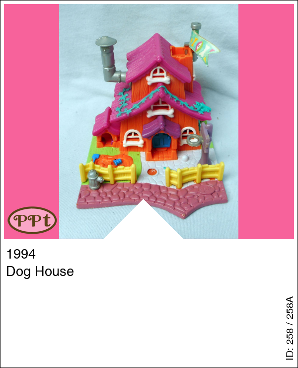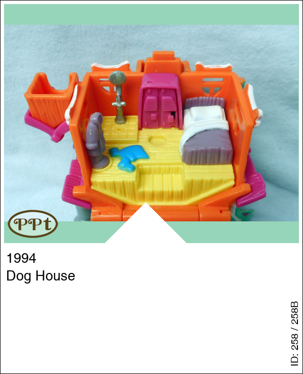 Een heel leuk oranje huisje met paars dakje. Hier leven 1 hondje en 1 kat samen met Polly. Aan de buitenkant een basketpaal, hondenhok, en brandweerpaaltje waar de hondjes tegen aan kunnen plassen, binnen zie je een woonkamer met potkacheltje en trapje naar boven waar de slaapkamer is met douche en kast (die je echt kunt opendoen). Polly, Chelsea Kitty, en Darrin Dog.