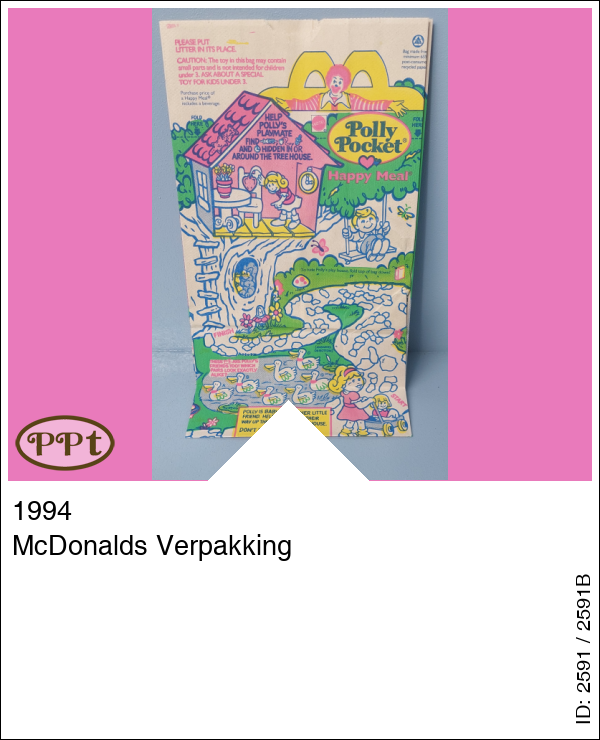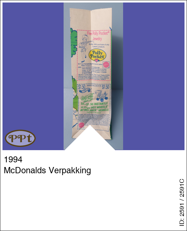 Dit is de verpakking waarin het McDonald eten in mee werd meegegeven. Er zat ook 1 van de 4 verschillende speelgoedjes in. Op de zak zie je een wandelpadje waar je moet meehelpen om Polly bij de boomhut zien te komen. Aan de andere kant staan afbeeldingen van Hotwheels.