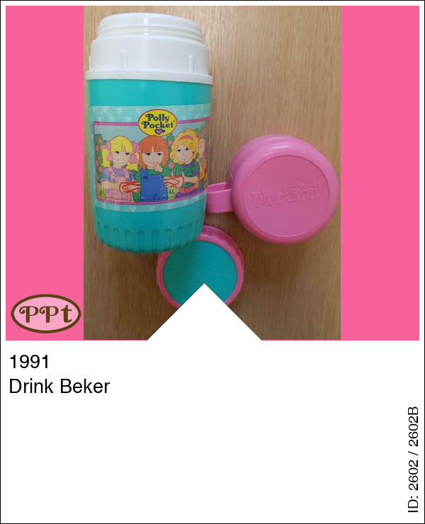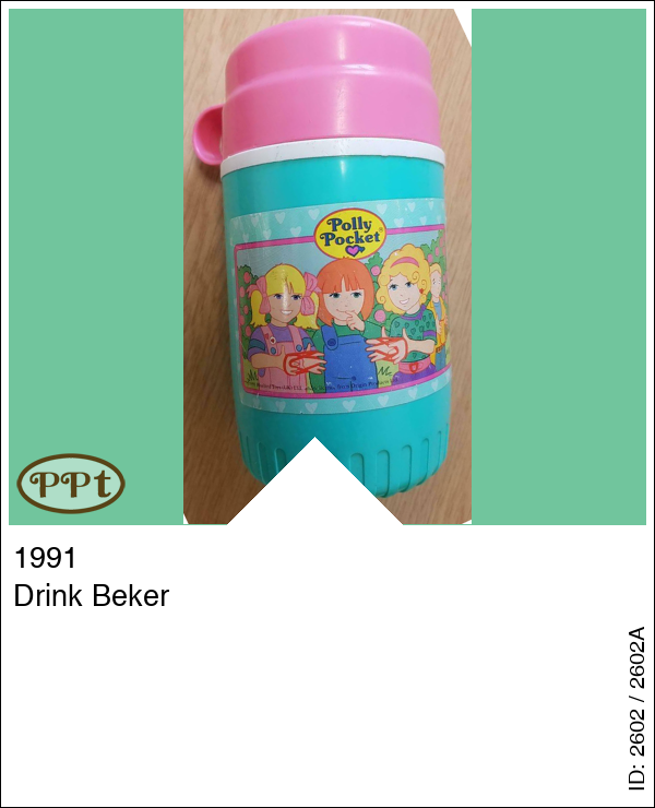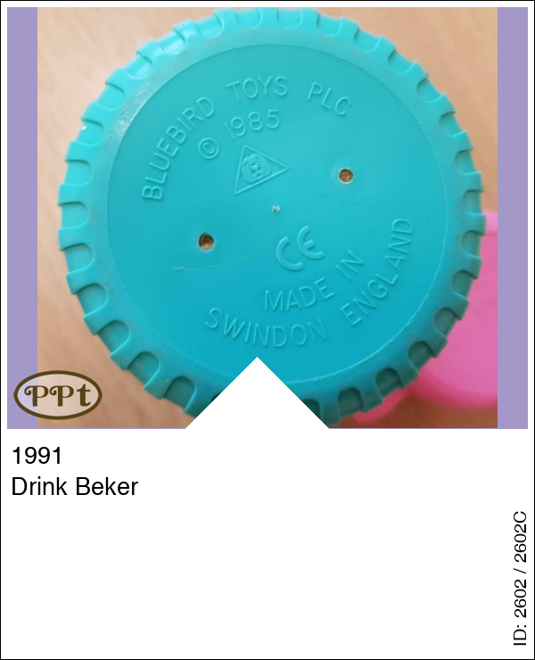 Drink Beker Leuke drinkbeker met tekening waarop Polly met haar vrienden touwtje knopen (spelletje met touw) aan het doen is. Onder de beker staat 1985 waarschijnlijk is deze beker toen gemaakt en het plaatje er in 1991 opgeplakt is.