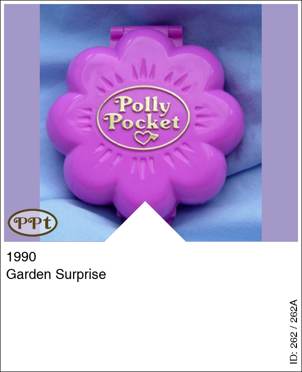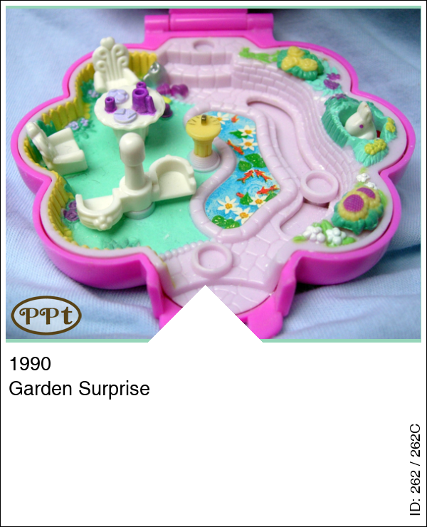 Dit is een roze doosje met de vorm van een bloem en binnen is een kasteel met deuren die echt open kunnen en daarachter zie je het huis staan. Beneden is de kasteeltuin en daar is een tafel en 2 stoeltjes, een draaimolentje voor 2 poppetjes en een zonnewijzer. Ook loopt er een baantje wat beweegt en als je aan de draaimolen draait komt er een konijn tevoorschijn. Met Polly en een wit beeldje.