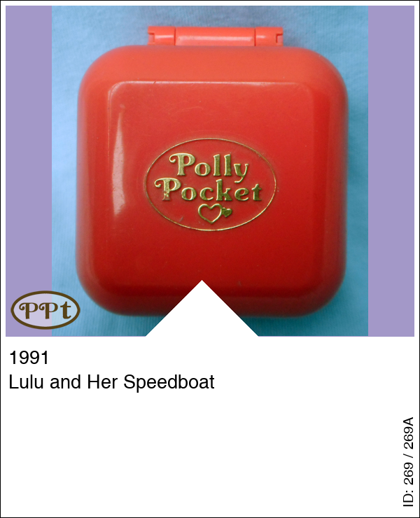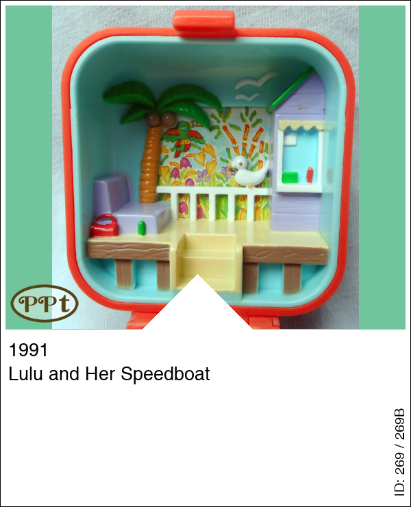 Een vierkant hoger doosje met binnen een Strandhuisje met zitbankje en een strand met aanlegsteiger. Ook zie je een dolfijn en reddingsboei waar je Lulu in kan zetten.