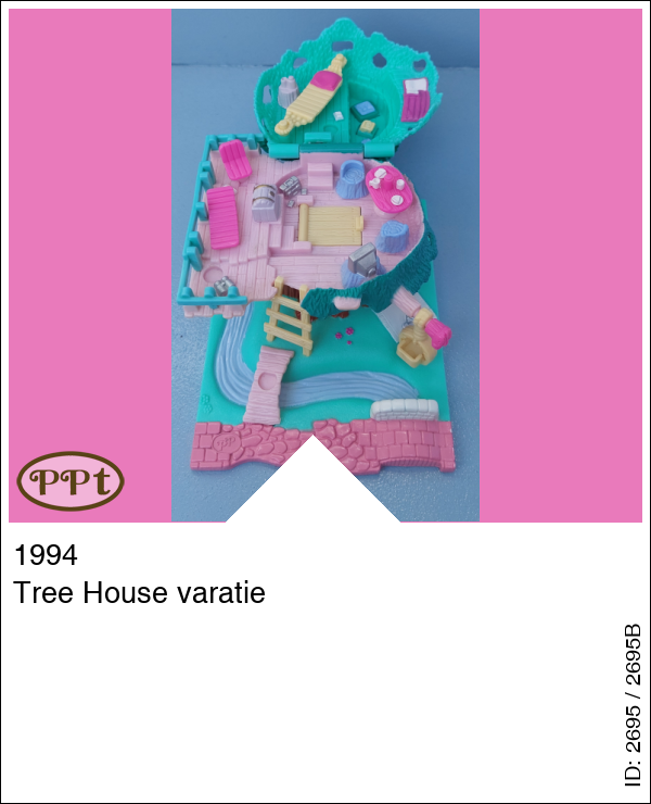 Een geweldig boomhuis met beneden een schommeltje, picknickkleed, een riviertje met bruggetje en dan ga je via het trapje het boomhuis in, je komt eerst op een terras met ligstoel en stoeltje. Je klapt de boom omhoog en dan zie je een hangmat, een paar kussens, slaapzak, en aan de andere kant een kist, radio, tv, en een tafel en stoeltjes. Ook kun je via het luik in de vloer naar beneden langs de glijbaan. Met Polly en Lulu.