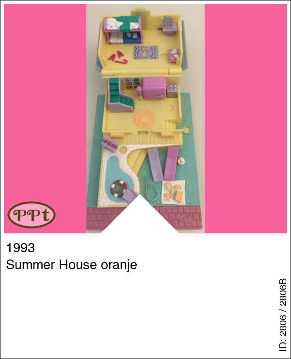 Een zomerhuisje met aan de buitenkant een barbeque en een zwembad waar het poppetje echt in kan, 2 ligbedden en een picknick-kleedje. Binnen een stapelbed en een koelkast die echt open kan. Polly en haar zonnebril en Alexia in blauw badpak.