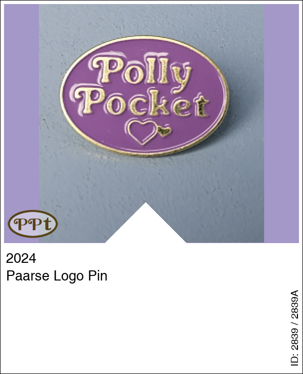 Paarse Logo PinUpdate: 02-07-2025 Een paarse pin in de vorm van het Logo van Polly Pocket, deze zie je zitten op bv Wonderfull Wedding Party en nog andere sets.