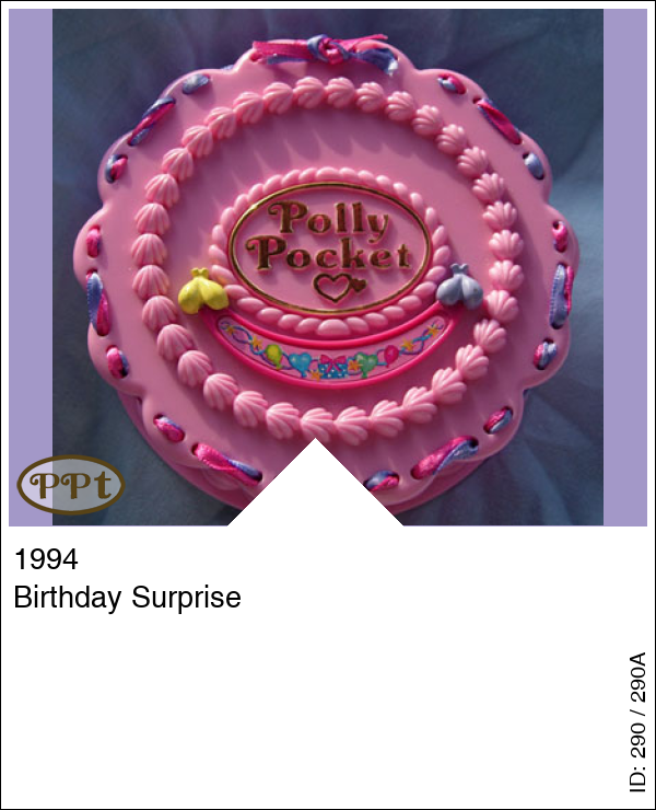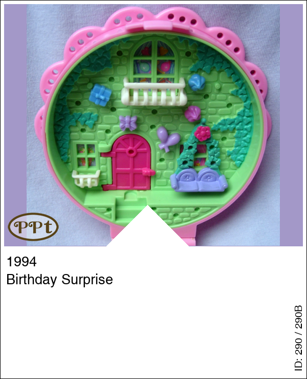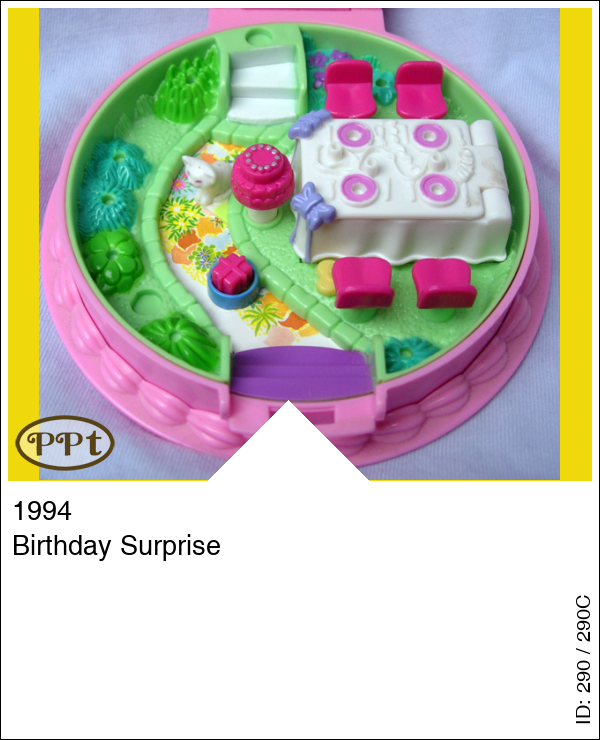 Een doosje in de vorm van een cadeau/taartje en binnenin een feestje, vooral als je het deurtje open doet en alle ballonnen ziet. Naast het deurtje een schommelstoel en boven de deur een balkon. In de tuin een wit gedekte tafel met 4 stoeltjes.De tafel kun je opendoen en daarin kunnen de ballonnetjes, strikjes, toefjes, cadeautjes, bloemetjes en hartjes. Deze pinnetjes kun je door heel het doosje prikken. Ook zie je een wit poesje wat je kan bewegen door aan het roze taartje te draaien. Met Polly, Daria, paarse en roze lint en de 30 pinnetjes