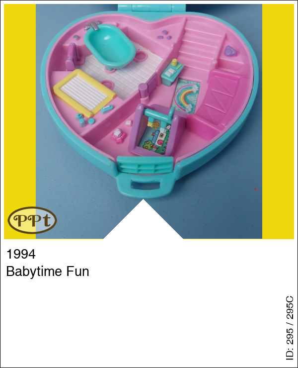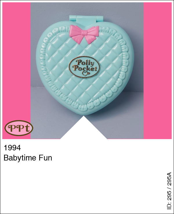 Een hartjesvorm doosje blauw/groen, en het lijkt aan de buitenkant een dekentje. Als je dit doosje opendoet dan zie je bovenaan een kinderkamer met volwassen slaapkamer en babykamer wanneer je aan het wieltje draait boven het wiegje dan gaan er aan iedere kant een schommeltje bewegen en boven het bedje draait een olifantje. Beneden zie je een speelplaats met badkamer en aankleedkussen en in de speelhoek een kleed met daarboven een speeltuigje wat echt beweegt. Met Polly en 2 baby'tjes Matt en Susie