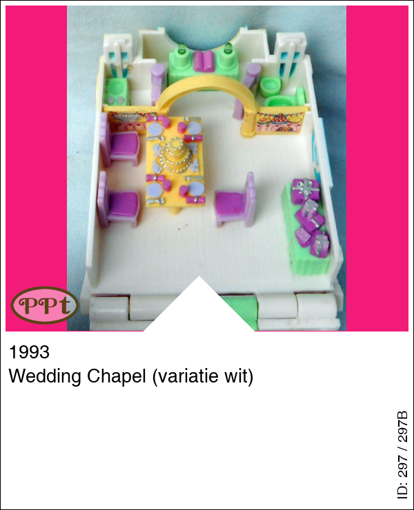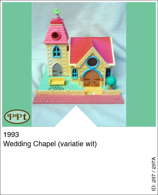 Dit trouwkapelletje is kompleet met licht en dat gaat branden als je op het groene knopje drukt wat op het torentje staat. Ik begin maar bij het kerktorentje als je dit opendoet is er een feestzaaltje met disco en een kaptafel en een spiegel, je kunt hier ook komen via de trap uit de kerk. Als je de kerk binnengaat dan zie je de kerkbanken en een altaar met orgel, achter het altaar is een trap waar je naar boven kan en daar kom je dan in een ruimte waar de bruifloft gevierd word met taart en cadeau's. Ook is daar een tafel met lichtjes (werkt) en een keukentje en toiletruimte met wastafeltje. Met de bruidegom en bruidje waarvan het onderste gedeelte van de jurk los kan, bruidsmeisje, groene kruisje.