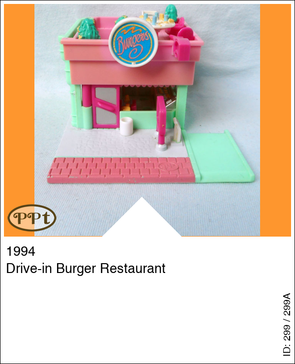 Een mcdonalds huisje compleet met mcdrive. Aan de buitenkant kan je met je roze auto op het groene plateau gaan staan en daar is de lijst waar je uit kunt kiezen en de praatpaal, als je dan verder rijdt heb je daar het raampje waar je bestelling krijgt. Dit huisje schuif je naar opzij open en dan kom je aan de bestelbalie je ziet de keuken en wat broodjes en de kassa, ook staat daar de prullenbak en waar je de dienblaadjes op kan leggen. Als je de trap opgaat dan kom je op het dakterras waar een tafel staat met 4 stoelen en ook weer een prullenbak. Met Polly, Gillian, de roze auto en het trosje ballonnen.