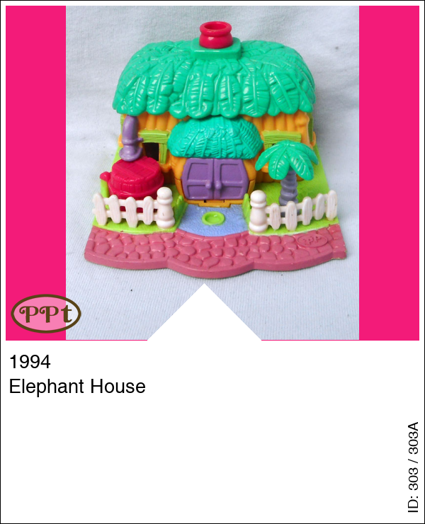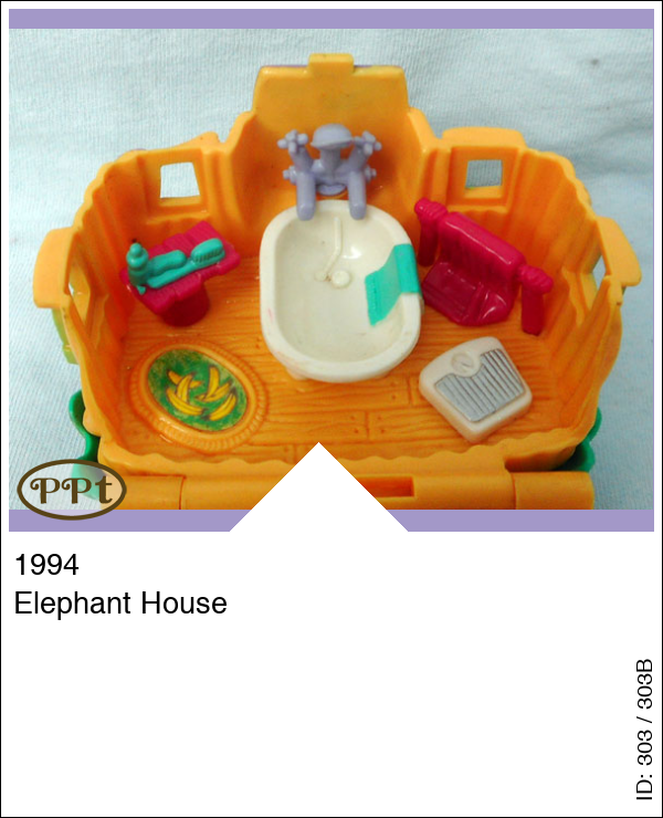 Dit is een andere versie huisje en dan met felle kleurtjes, maar wel net zo leuk, als je het bladeren dakje omhoog doet zie je een huiskamer met radio en boxen, een grote roze stoel en klein wit stoeltje, een trap naar de eerste verdieping en boven is een bad en een weegschaal, tafeltje met spulletjes en een standaard voor de handdoek. Buiten staat nog een regenton welke open kan dit is het huisje van de muis, er is ook een palmboom. Met olifant en zijn saxofoon, Polly met trompet en Madison muis.