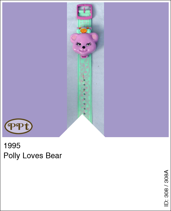 Deze horloge heeft een groene band met versiersels en het horloge zelf heeft het hoofdje van een beer. Binnen het horloge zie je een bos waar de beer leeft en je kan hem voeren. He ziet een tafel, stoeltjes en een picknickmandje wat open kan. Met Polly en een beertje.