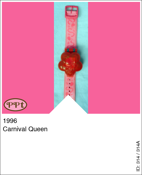 Deze horloge heeft een roze band met versiersels, het horloge is een roze bloem. Binnen zie je een spiegel met een omlijsting van ballonnen en een stukje waar polly op kan gaan staan. Het onderste gedeelte is blauw en ook daar zitten ballonnen en bloemetjes. Ook als je hier polly op zet kan je ze door middel van het wieltje ronddraaien. Onder het blauwe zit ook nog een vakje waar je de losse spulletjes in kan doen.