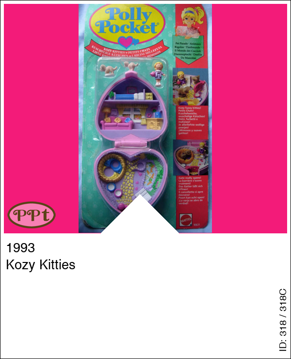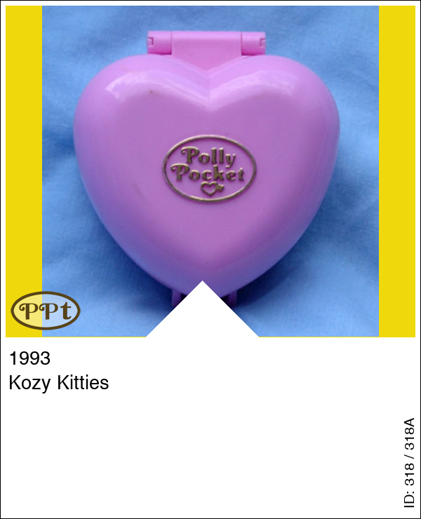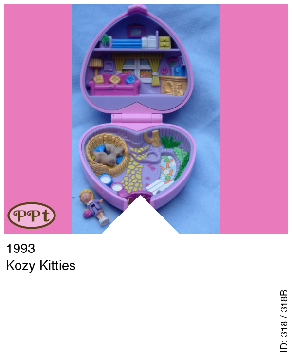 Dit is een roze doosje in de vorm van een hartje. Binnen zie je een huiskamer met bank en open haard, en boven is een slaapkamer. Aan de andere kant zie je een tuin met daarin een vijver met visjes en een bankje en ook staat er een mandje met twee poesjes. Met Polly en in haar hand een bol wol.