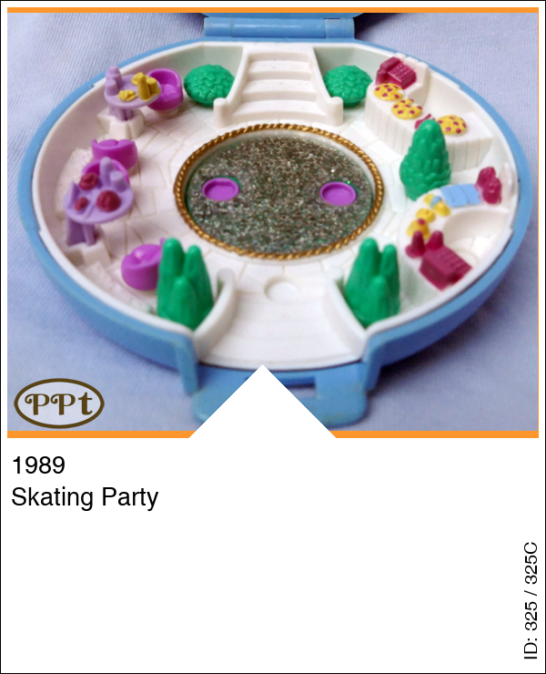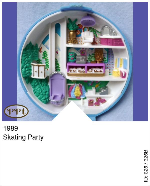 Dit is een doosje met binnen in een winkelcentrum met bovenin een lift, balkon en de bovenste winkel is een kapper, daaronder zit de juwelier met kassa en een vitrine met juwelen en beneden is een kledingshop. De andere kant van het doosje is een schaatsbaan en deze glittert, als je aan het boompje draait dan draait de vloer rond. Je kunt er gezellig wat zitten en dan pak je bij de kraampjes een pizza of wat te drinken of een broodje. Met Polly en vriendin Little Lulu op schaatsen.