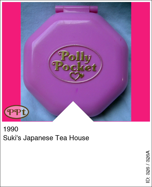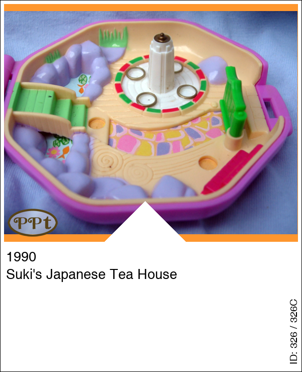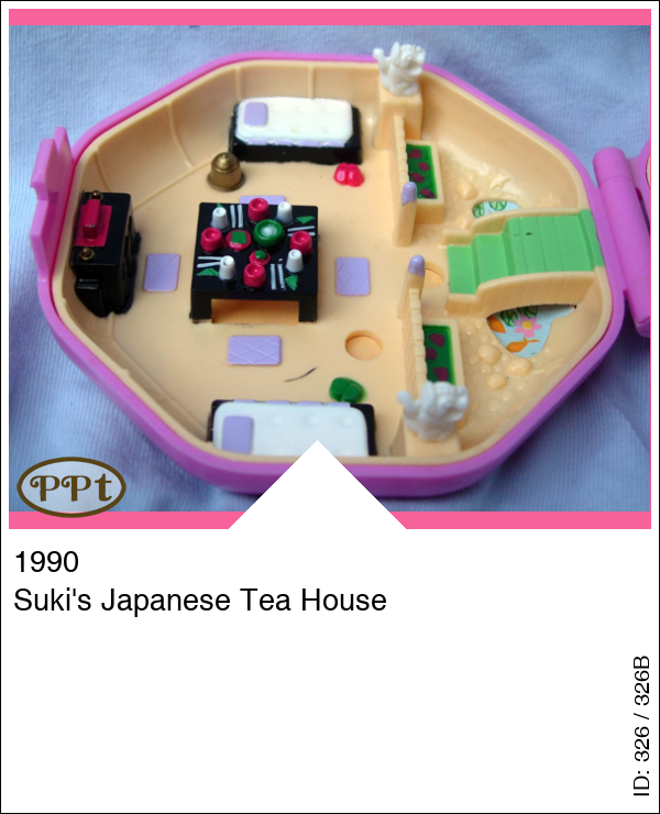 Een 6 hoekig doosje met binnen een Japans Theehuisje compleet met de bekende Japanse beelden en relaxtuin en gedekte tafel. 2 Japanse Popjes genaamd Atsuko met het witte pak aan en Suki met het paarse jurkje.