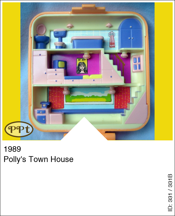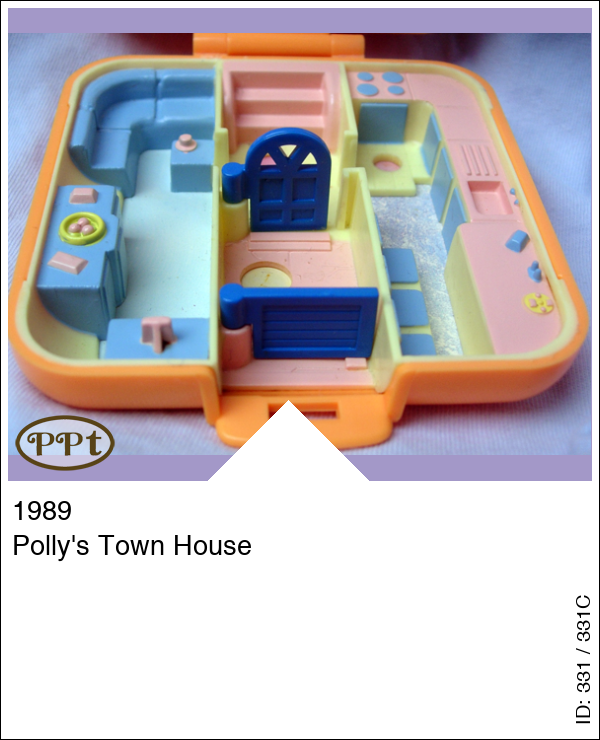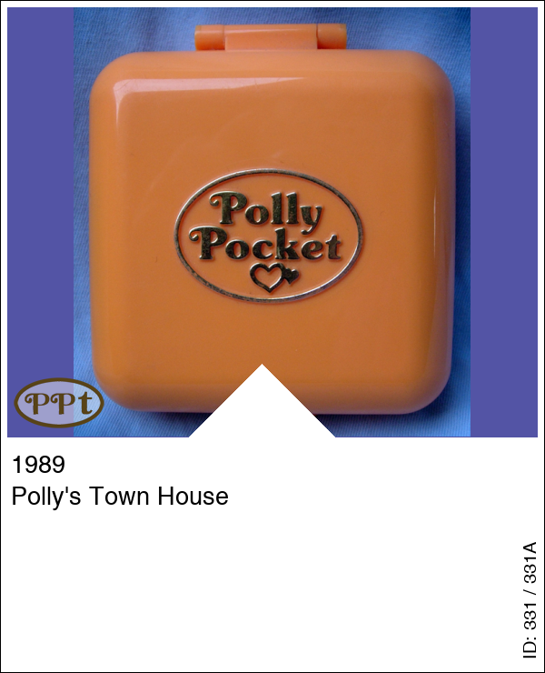 Dit is een oranje doosje met binnenin een woning compleet met woonkamer, keuken, slaapkamer, badkamer en voordeur. Met Polly en hondje en poesje.