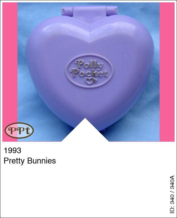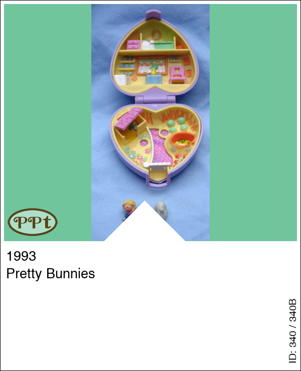 Een lila doosje in de vorm van een hartje met aan de binnenkant boven een huiskamer en slaapkamer en beneden een tuintje met hekje, kropjes sla en een hokje voor de konijntjes. Met Polly en 2 konijntjes.