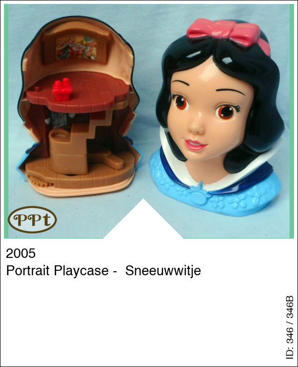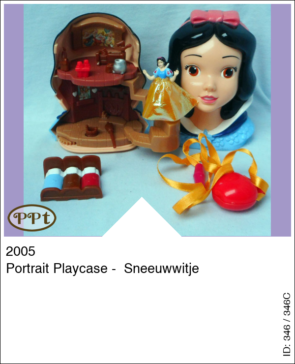 Je kunt het hoofdje open maken en binnenin is een huisje met beneden een foto van hertjes en konijntjes en je kunt sneeuwwitje op een rondje zetten en d.m.v. een wieltje rond laten draaien. Boven is een schilderijtje van de dwergen en een trapje wat je uit kan klappen. Compleet met Sneeuwwitje, gele rok, een afwasbak, bedje (3 naast elkaar), een bezem, emmer en een kookpot. Als extra zit er een halsketting bij met een doosje (vorm appel)en binnenin kan je een foto doen.