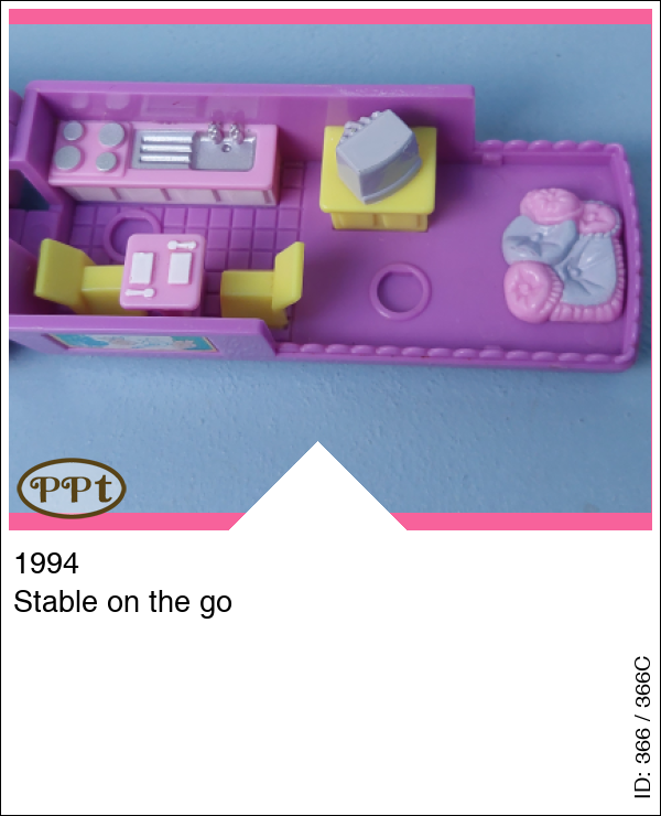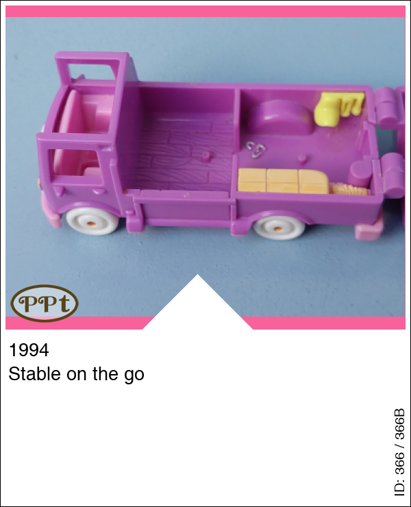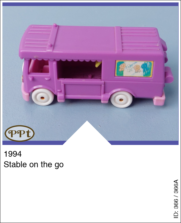 Dit is een paars busje wat paardjes vervoert. Als je het dak openklapt zie je een ruimte voor de paardjes met een klepje wat naar beneden kan en de paardjes eruit kunnen lopen, als je naar de andere zijde gaat is een kussenzithoek met tv en een keukenblokje en zithoekje met tafel en 2 stoelen. Polly en 1 wit paardje en 1 bruin paardje met geel zadel.
